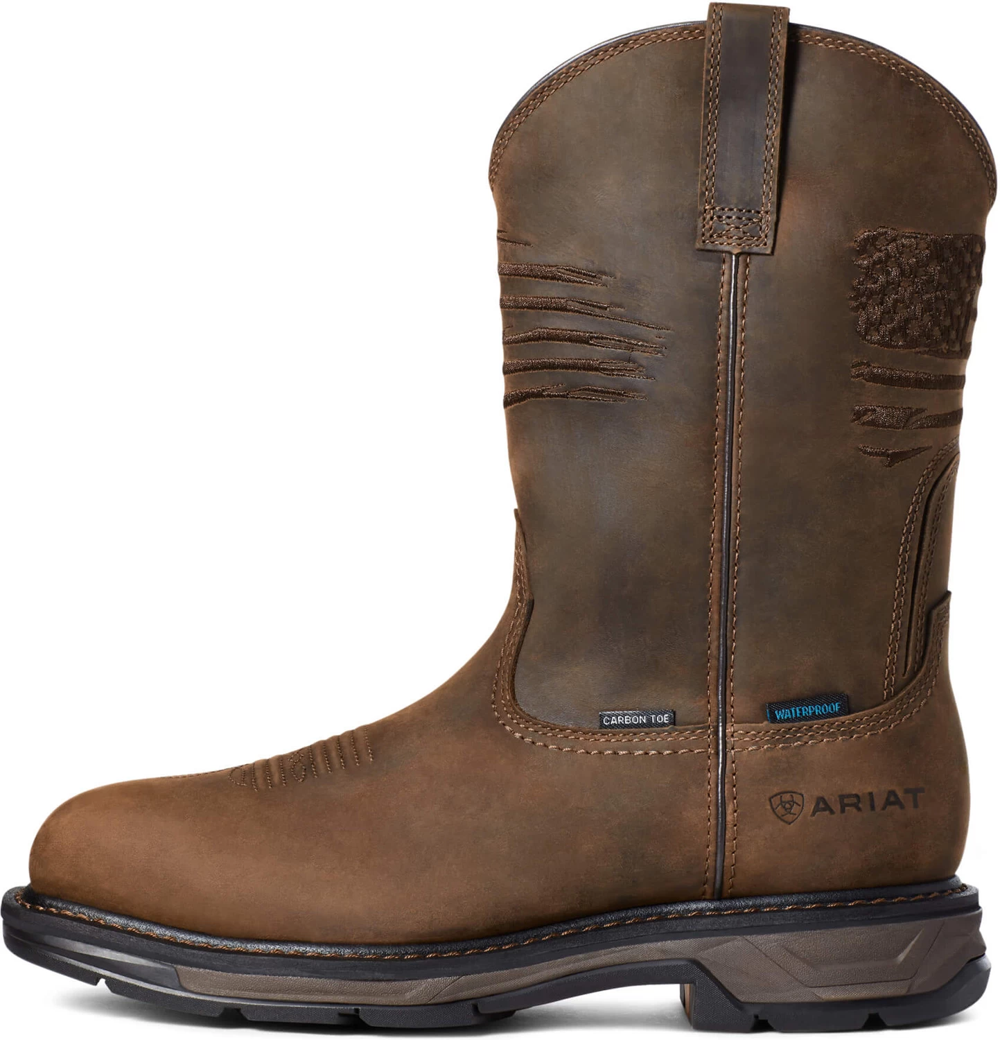 Leather upper. U.S. flag embroidered on upper. WorkHog Waterproof PRO construction with waterproof membrane. Removable Energy Max anti-fatigue footbed. ATS Max extra wide shank for maximum support and less fatigue.EVA midsole. Oil and slip resistant Duratread outsole with 90 degree heel breast. Goodyear welt construction. Carbon safety toe. EH. WP. ASTM F2413-18 M/ I/ C EH compliant.