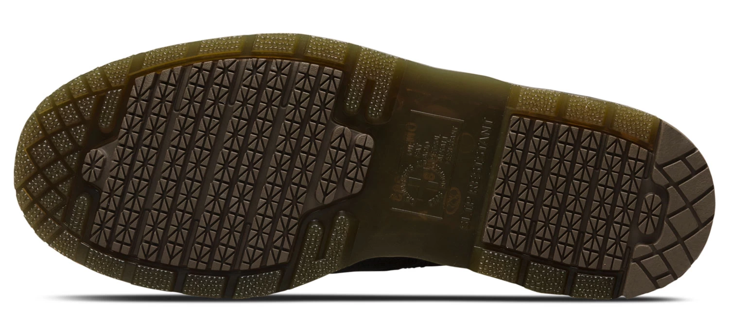 Water and spill resistant, full grain leather upper. Memory foam footbed with moisture wicking SoftWair cover. PVC outsole with rubber pods of GRIP-TRAX slip resistant rubber. Soft toe. No safety toe cap.