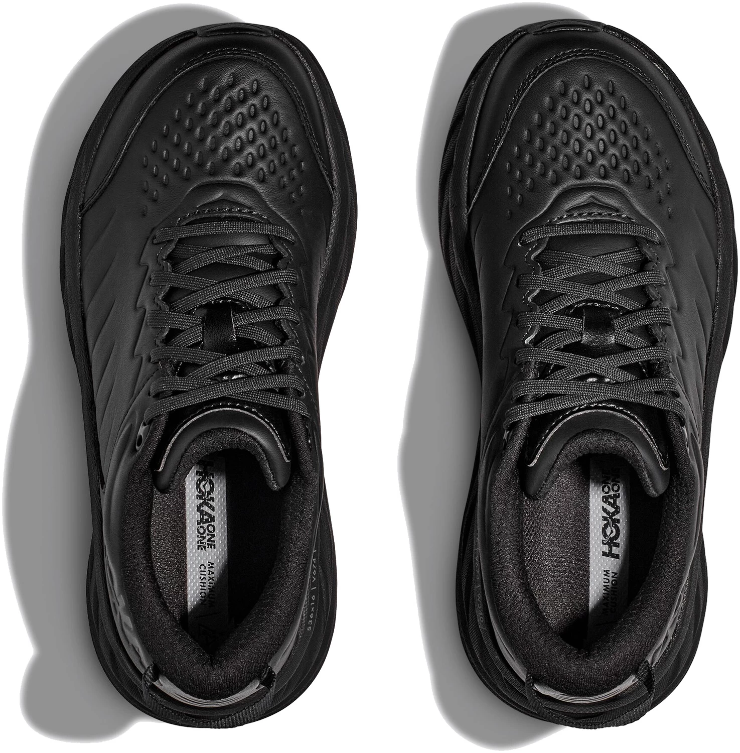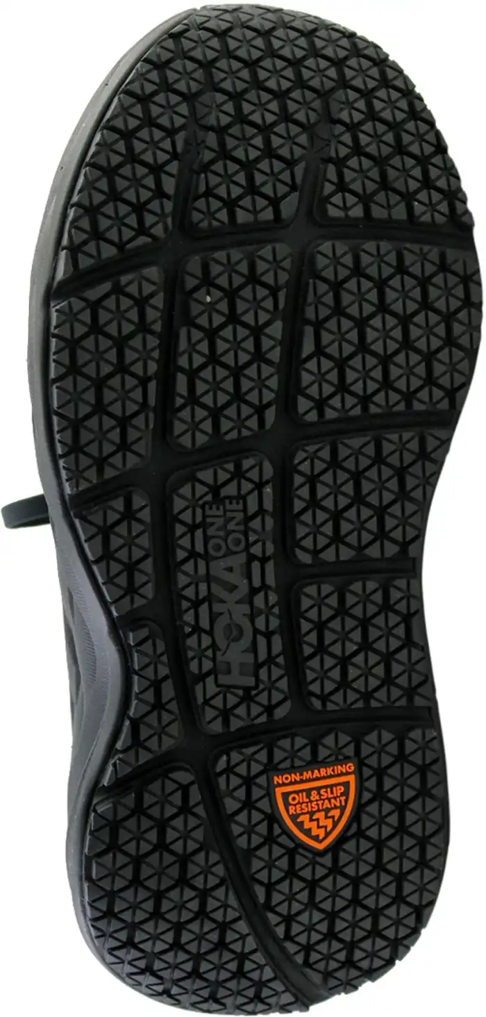 Water resistant leather upper protects against moisture. Memory foam collar for plush comfort. Compression molded EVA midsole for signature HOKA cushioning. Early stage Meta-Rocker for a smooth ride through each step. Full ground contact slip-resistant rubber outsole. Soft toe. No safety toe cap.