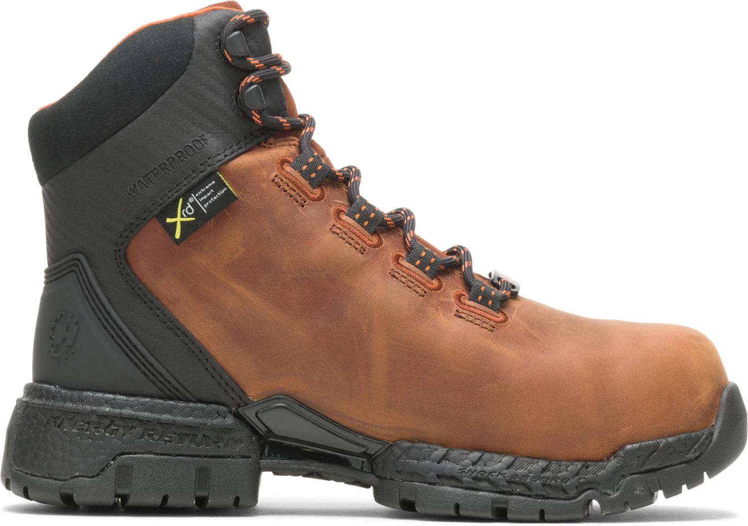 Full grain waterproof leather upper with TecTuff abrasion resistant collar strap. . Moisture wicking mesh lining with waterproof membrane and CoreTemp temperature control technology. Removable FootRests tri-layer anti-fatigue footbed. Xergy anti-fatigue foam midsole. FootHolds oil and slip resistant rubber outsole. Nano toe. EH. XRD internal met guard. WP. Metal free. ASTM F2413-18 F/ I/ C EH Mt compliant. 30 day comfort guarantee.