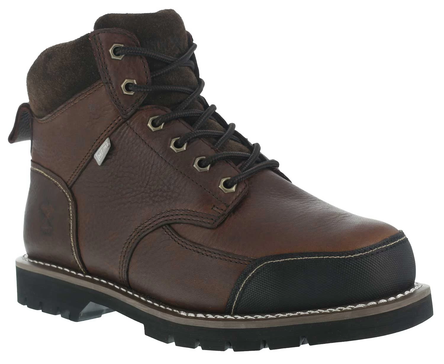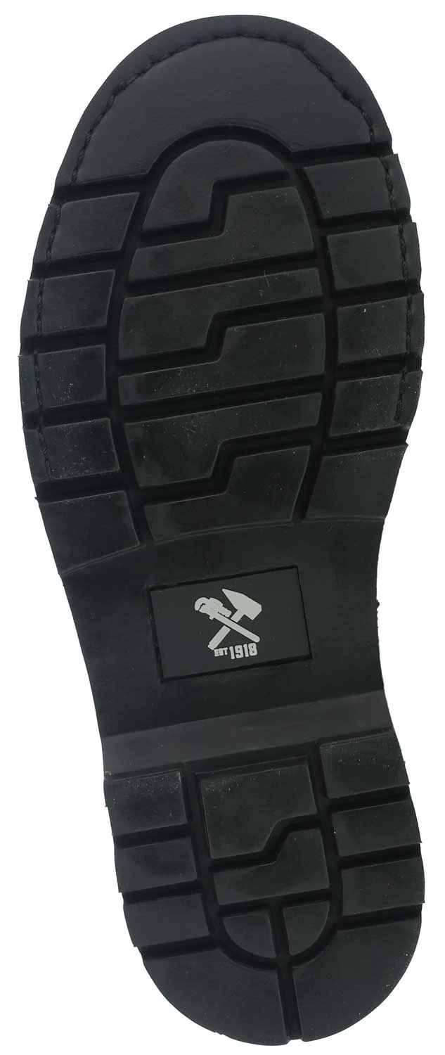 Leather upper. Abrasion resistant toe bumper. Moisture wicking nylon mesh lining. Removable EVA cushion footbed with sponge rubber heel wedge. Rubber lug outsole. Goodyear welt construction with Kevlar stitching.Steel toe. EH. Internal Flex-Met metatarsal guard. ASTM F2413-18 M/ I/ C EH Mt compliant.