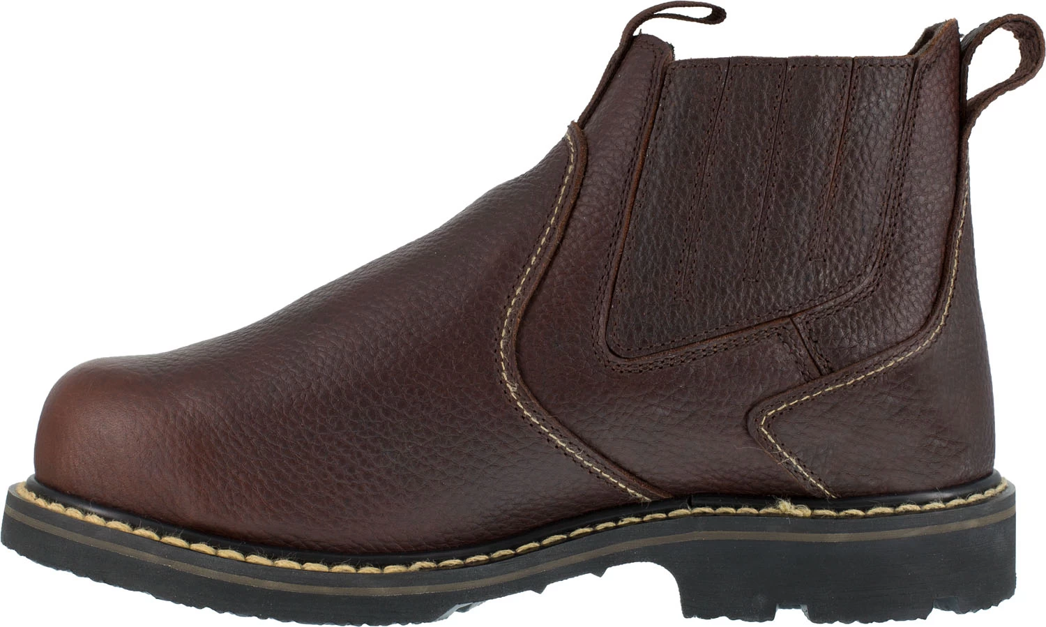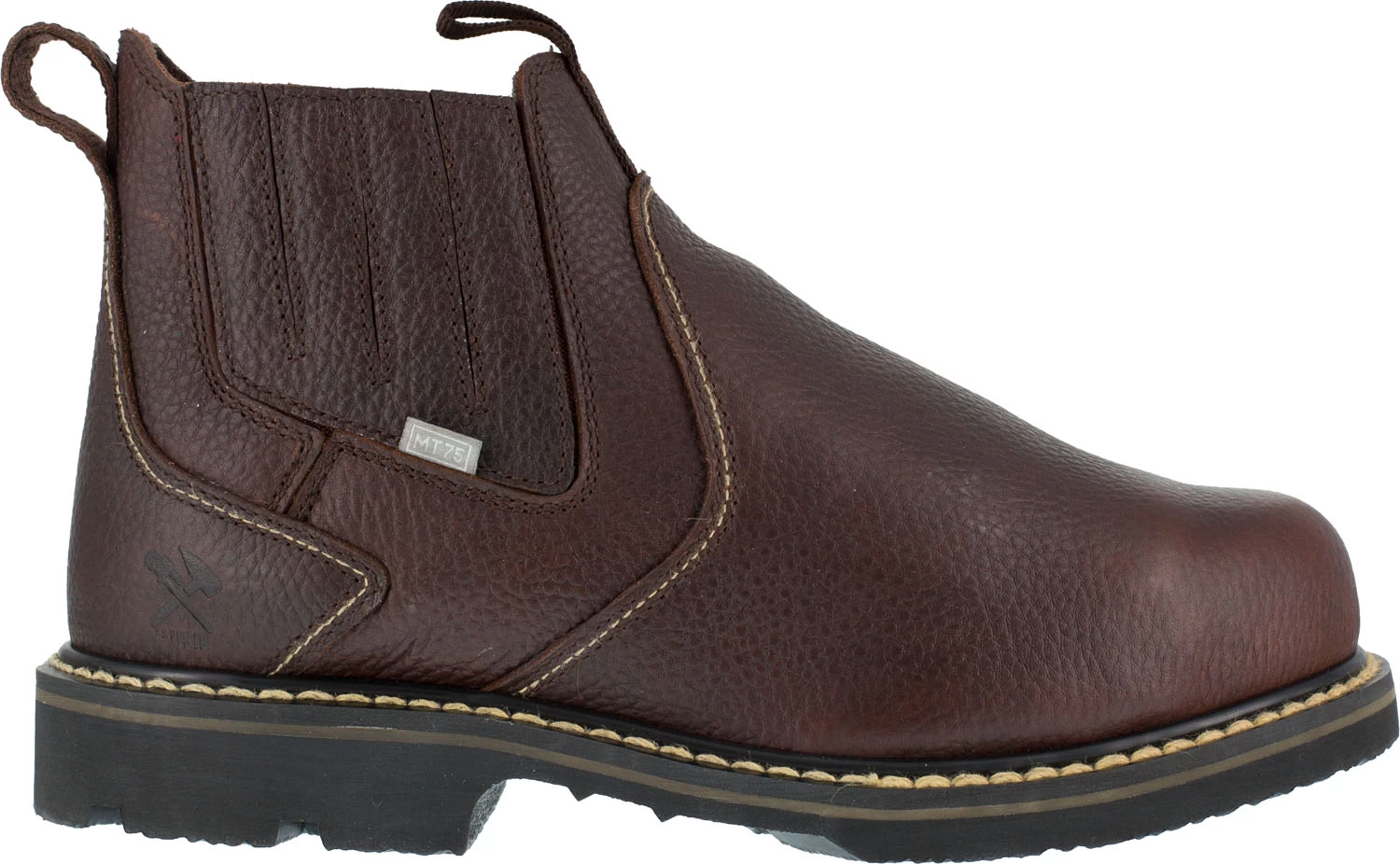 Leather upper with leather covered elastic gore side panels. Quick-Release elastic collar with two pull tabs. Moisture wicking mesh lining. BootBed dual layered, memory foam footbed. Vibram TC4 rubber outsole is heat resistant to 572 degrees F.Steel toe. EH. CushGuard internal met guard. ASTM F2413-18 M/ I/ C EH Mt compliant.