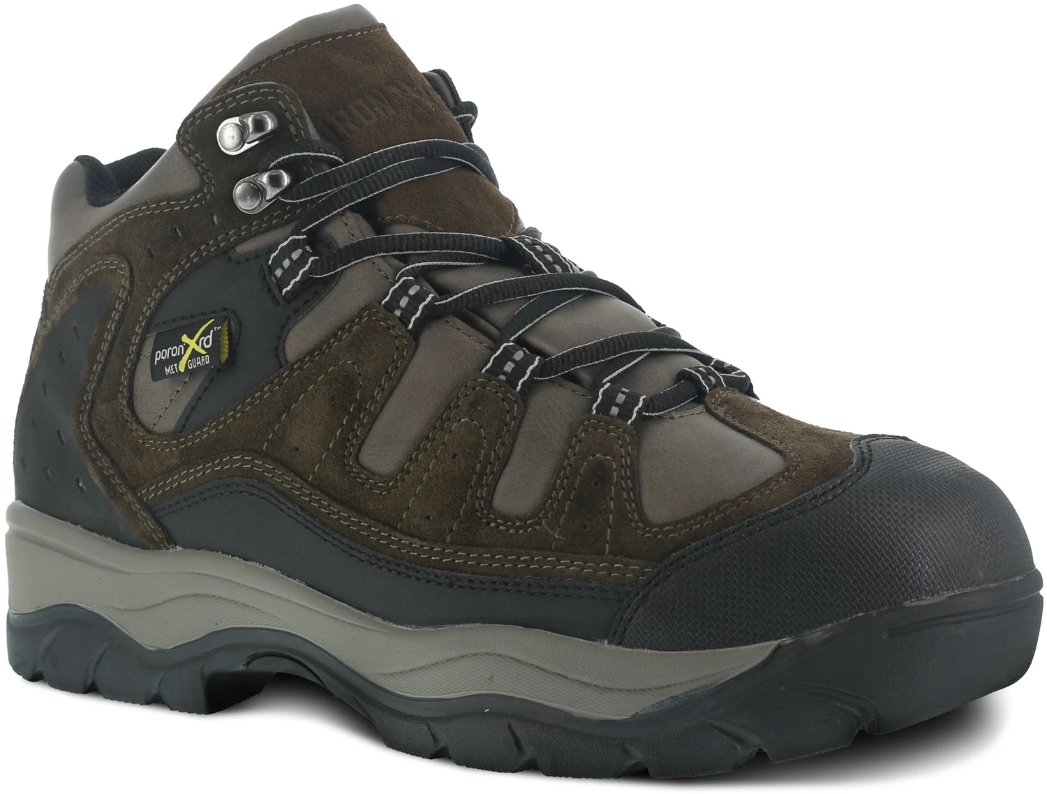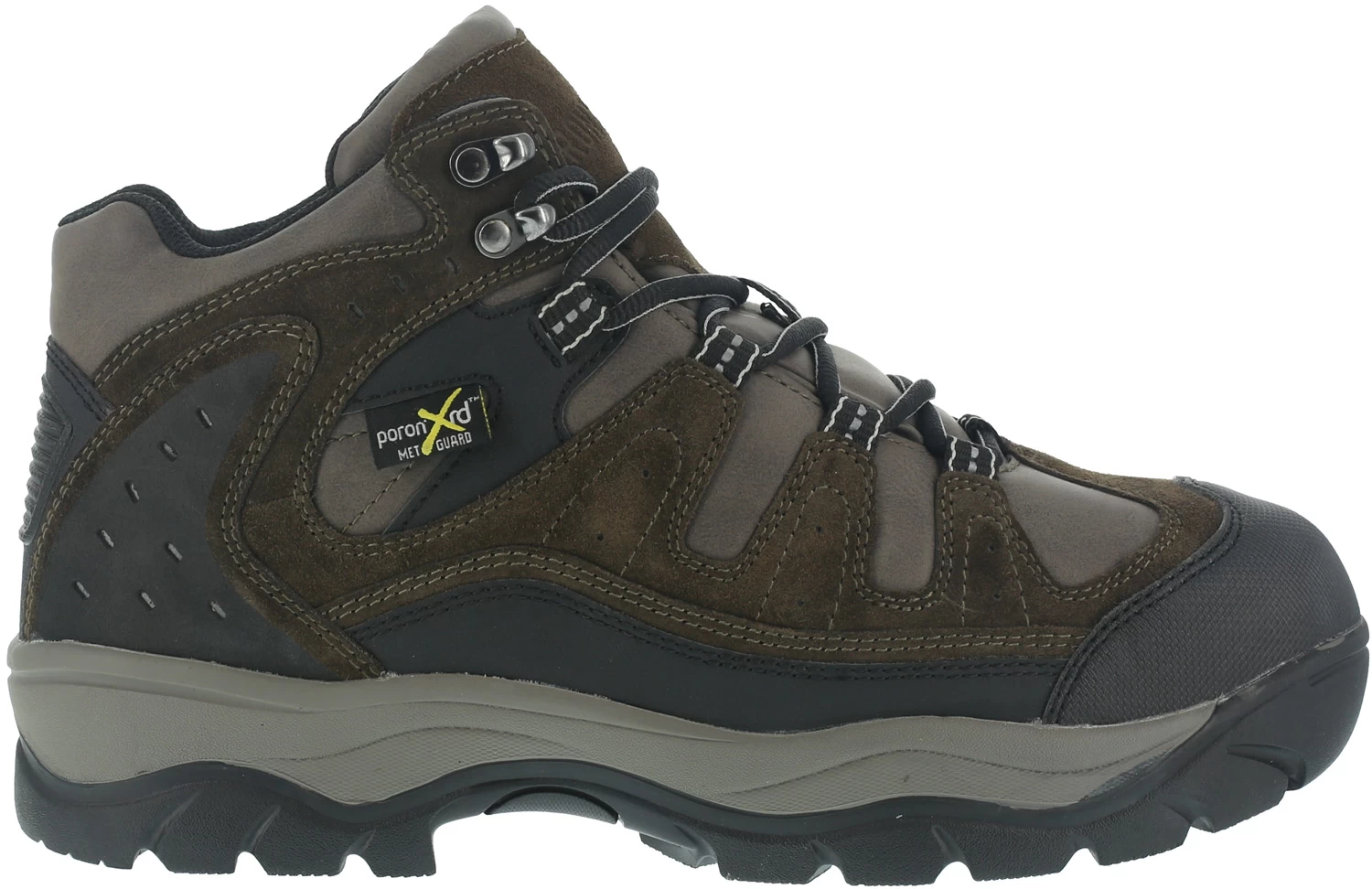 Leather upper with Scuff Tough high abrasion toe overlay. Moisture wicking nylon mesh lining. Removable EVA cushion footbed with sponge rubber heel wedge. EVA cushion midsole.Oil and slip-resistant, dual density rubber outsole. Steel toe. EH. Poron XRD internal met guard. ASTM F2413-18 M/ I/ C EH Mt compliant.
