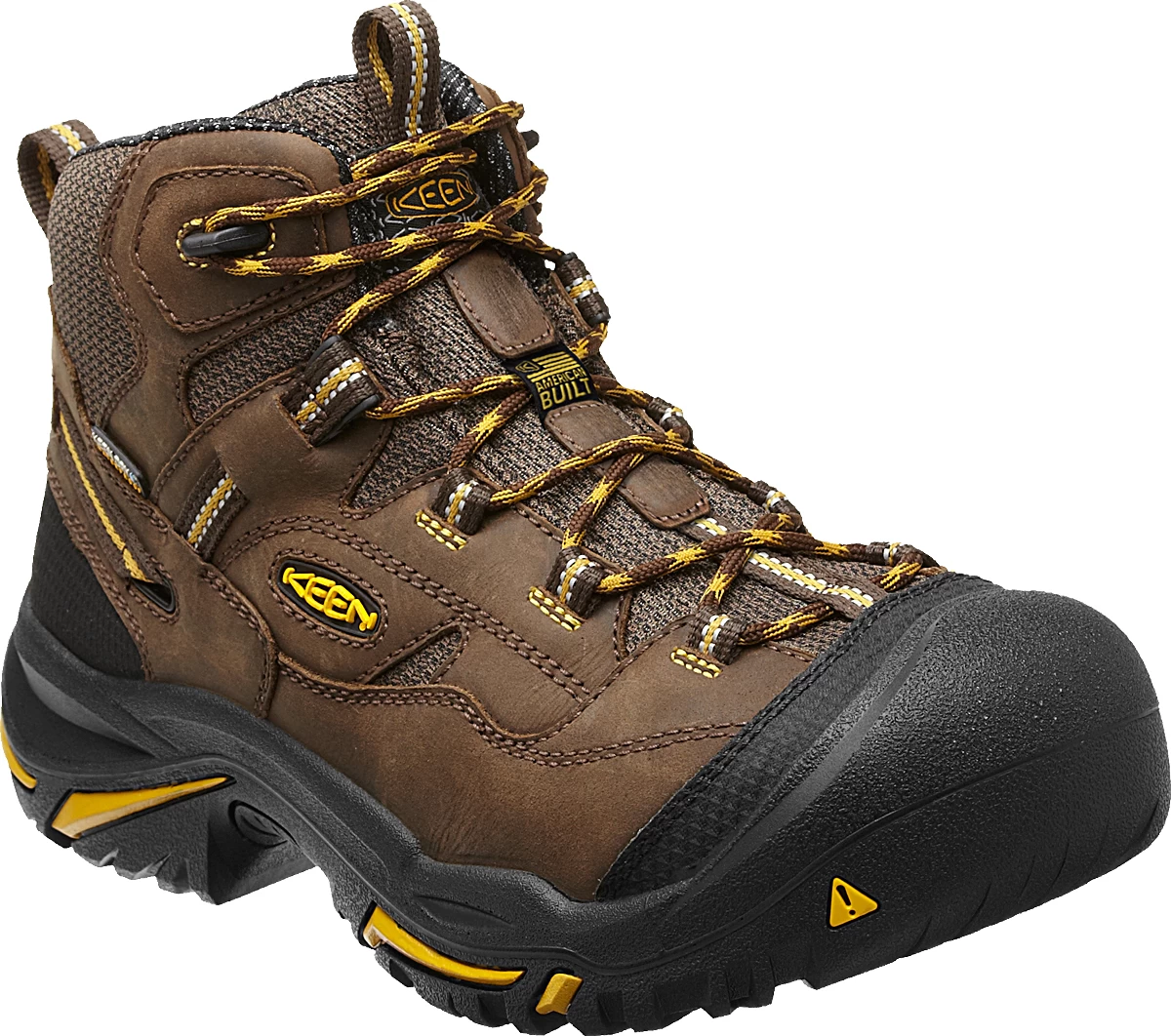 Waterproof nubuck leather upper. 2 Zone comfort lining with KEEN.Dry waterproof, breathable membrane. Removable metatomical dual density EVA footbed. Oil and slip resistant rubber outsole. Assembled in USA.Steel toe. EH. ASTM F2413-18 M/ I/ C EH compliant.
