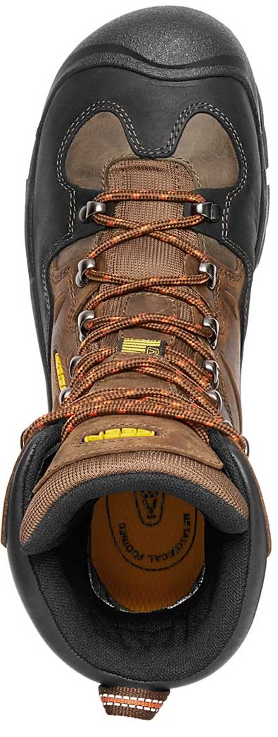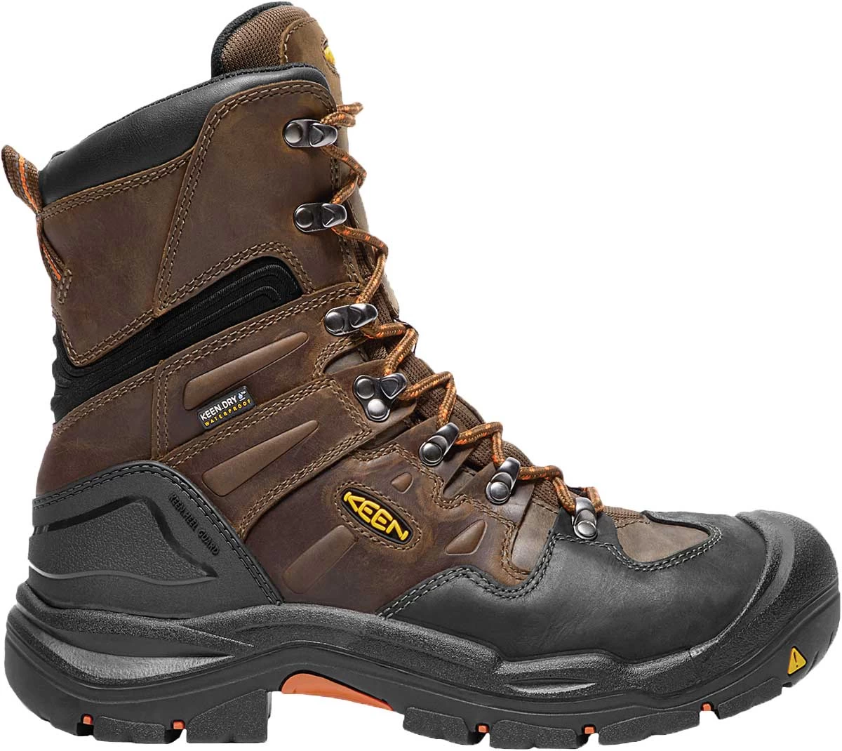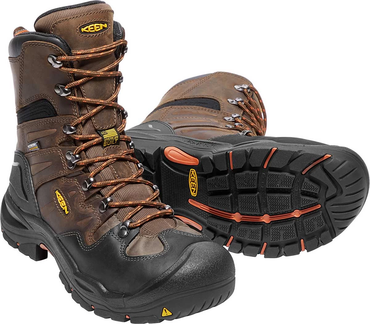 Waterproof leather and KEEN.Tuff-Tex abrasion resistant fabric upper. Molded heel guard protection. Hydrophobic/hydrophilic 2 zone comfort lining with KEEN.DRY waterproof, breathable membrane. CLEANSPORT NXT treatment for odor control.Removable metatomical dual density EVA footbed. Direct attached PU midsole. Oil and slip resistant, nonmarking rubber outsole. Steel toe. EH. Waterproof. Assembled in USA. ASTM F2413-18 M/ I/ C EH compliant.