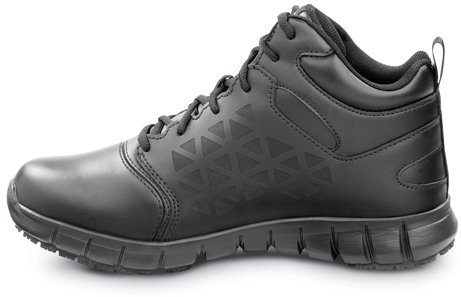 Leather upper. Moisture wicking mesh lining. Memory Tech Massage removable cushioned footbed. Sublite EVA midsole. Oil and slip resistant SR Max MaxTRAX patented rubber outsole. Soft toe. No safety toe cap.