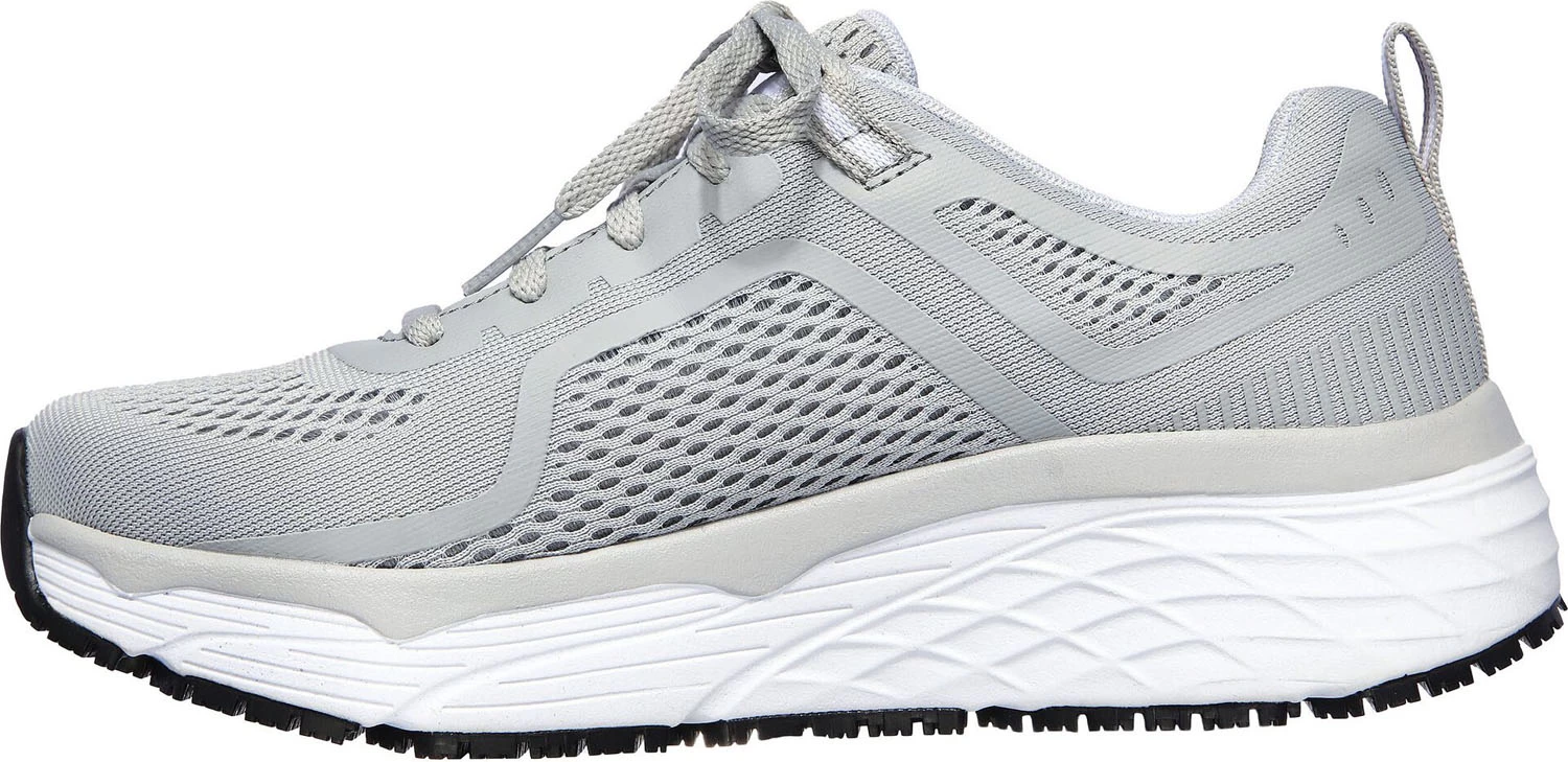 Breathable mesh knit upper. Aircooled memory foam cushioned footbed. Max Cushioning Elite design. ULTRA GO Work cushioning platform for shock absorption. Oil and slip resistant rubber outsole. Soft toe. No safety toe cap. Machine washable.