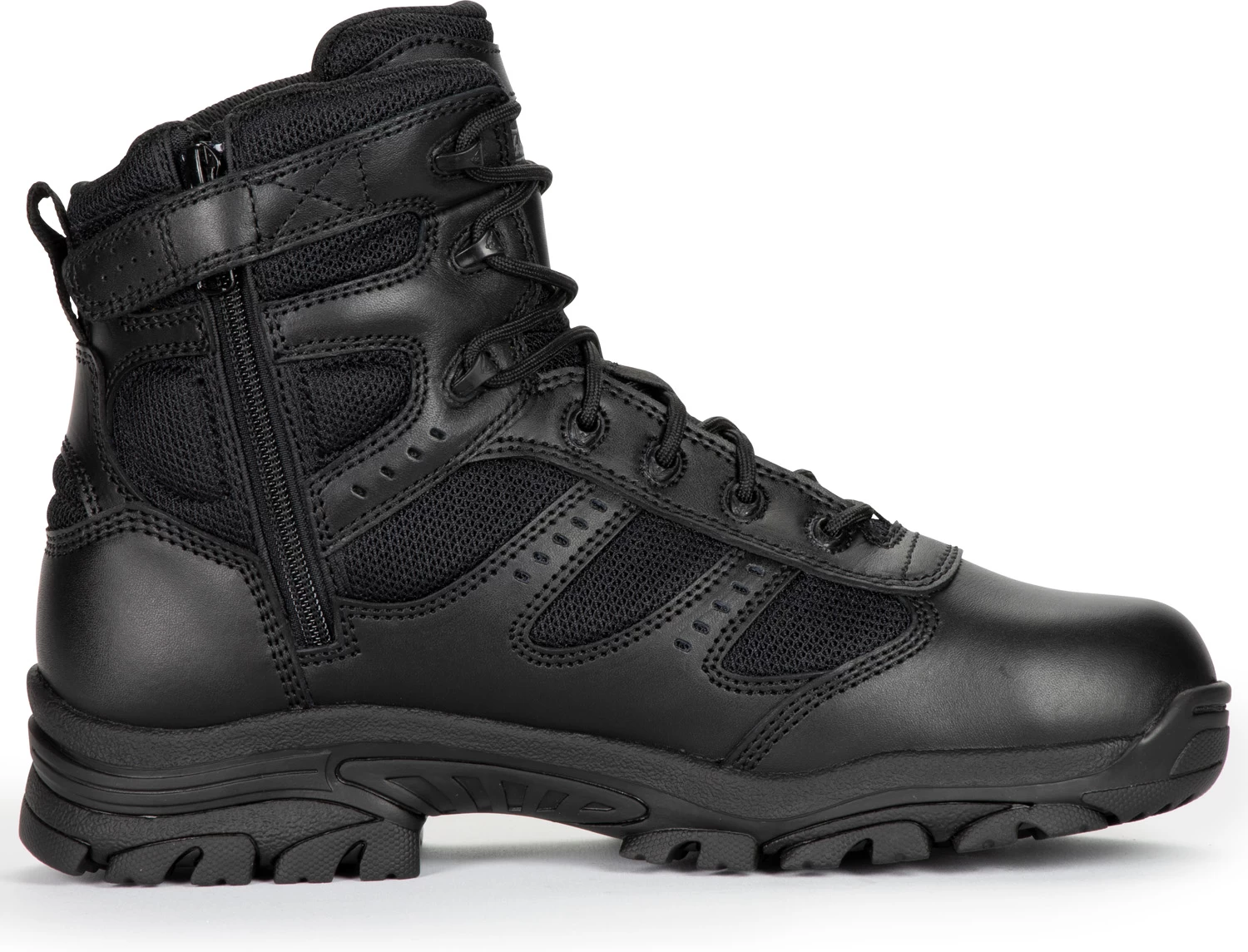 Leather upper with 400g air mesh nylon upper. YKK inside quarter zipper. BBP X-Stream waterproof membrane. Blood borne pathogen resistant. Removable PU SHOCK ZONE cushion footbed. Z-Trac ASR dual density slip resistant rubber outsole.100% nonmetallic. Comp toe. EH. ASTM F2413-18 M/ I/ C EH compliant.