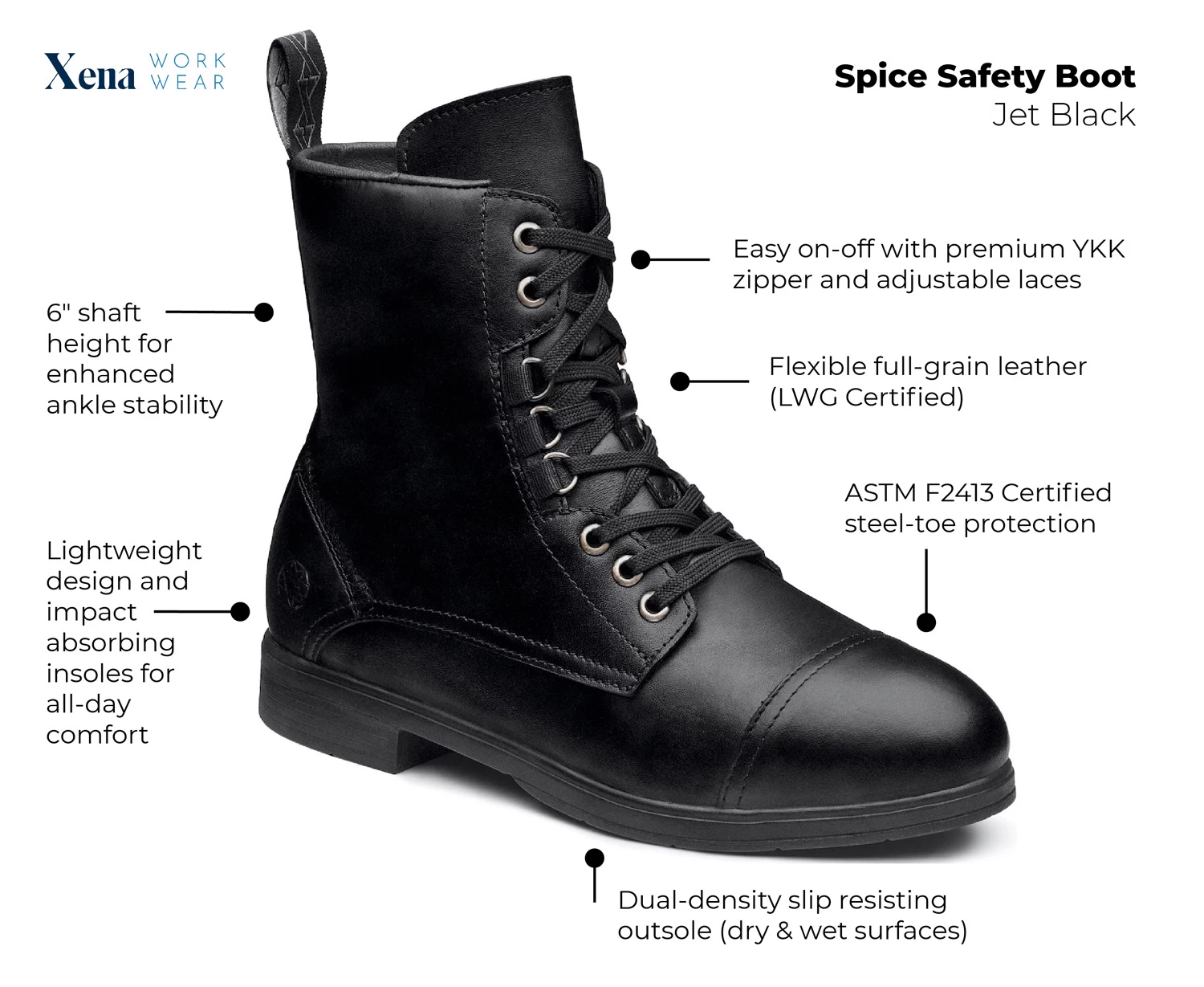 Full grain leather upper. Adjustable lace front with inside quarter zipper. Back nylon pull loop. Air-Flow Tech breathable mesh lining. Impact absorbing antimicrobial footbed. Oil and slip resistant dual density outsole. Steel toe. ASTM F2413-18 F/ I/ C compliant. Hand crafted in North America. 6 month Xena warranty.